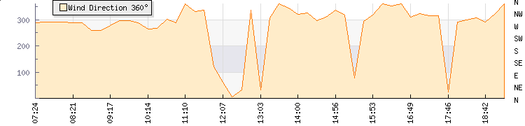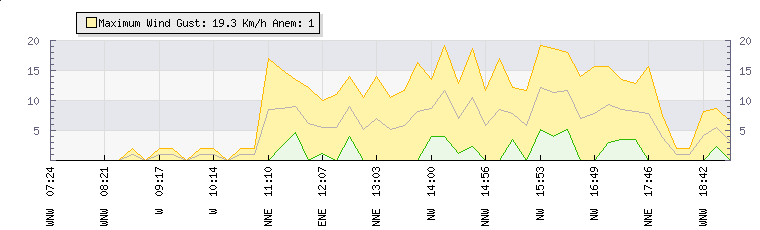 In the last few minutes the wind was North Westerly at an average speed of 8 kmh, reaching up to 13 kmh and a low of 4 kmh. The gust strength is9 kmh above the minimum speed |