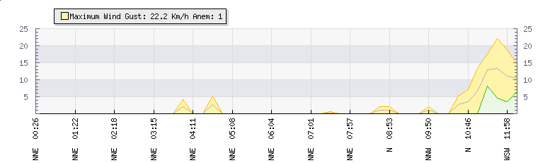 In the last few minutes the wind was Northerly at an average speed of 4 kmh, reaching up to 7 kmh and a low of 0 kmh. The gust strength is7 kmh above the minimum speed |