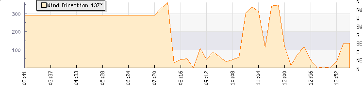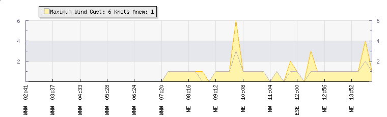 In the last few minutes the wind was East North East at an average speed of 1 knots, reaching up to 3 knots and a low of 0 knots. The gust strength is3 knots above the minimum speed |