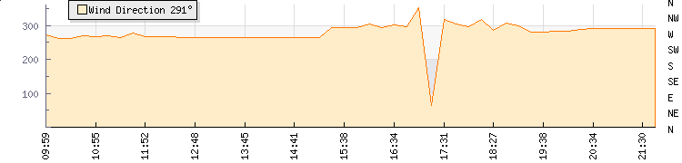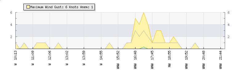 In the last few minutes the wind was West North West at an average speed of 0 knots, reaching up to 0 knots and a low of 0 knots. The gust strength is0 knots above the minimum speed |