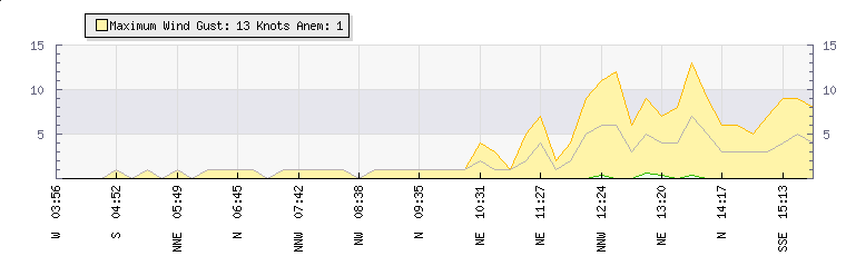 In the last few minutes the wind was North Easterly at an average speed of 4 knots, reaching up to 8 knots and a low of 0 knots. The gust strength is8 knots above the minimum speed |