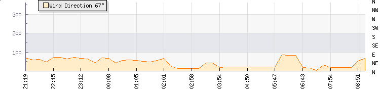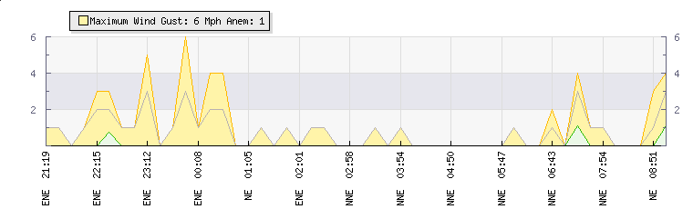 In the last few minutes the wind was North North East at an average speed of 1 mph, reaching up to 1 mph and a low of 0 mph. The gust strength is1 mph above the minimum speed |