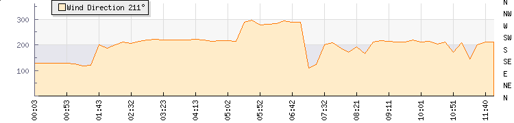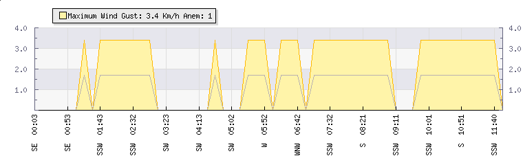 In the last few minutes the wind was South Westerly at an average speed of 2 kmh, reaching up to 3 kmh and a low of 0 kmh. The gust strength is3 kmh above the minimum speed |