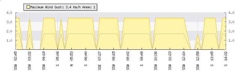 In the last few minutes the wind was South South West at an average speed of 2 kmh, reaching up to 3 kmh and a low of 0 kmh. The gust strength is3 kmh above the minimum speed |