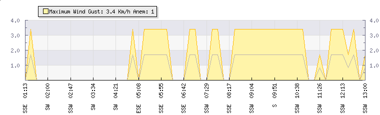 In the last few minutes the wind was Southerly at an average speed of 0 kmh, reaching up to 0 kmh and a low of 0 kmh. The gust strength is0 kmh above the minimum speed |