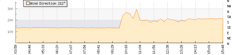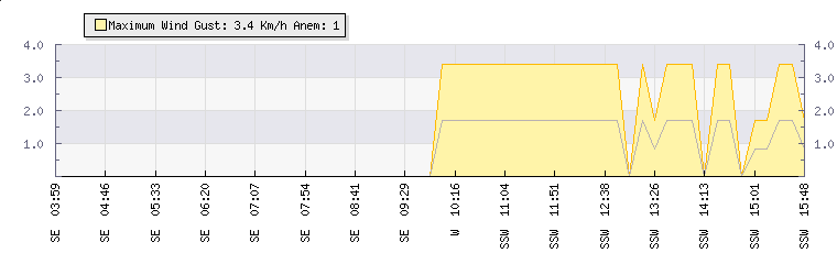 In the last few minutes the wind was South South West at an average speed of 2 kmh, reaching up to 3 kmh and a low of 0 kmh. The gust strength is3 kmh above the minimum speed |