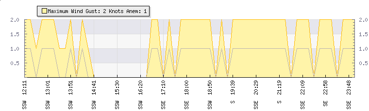 In the last few minutes the wind was South Easterly at an average speed of 0 knots, reaching up to 0 knots and a low of 0 knots. The gust strength is0 knots above the minimum speed |