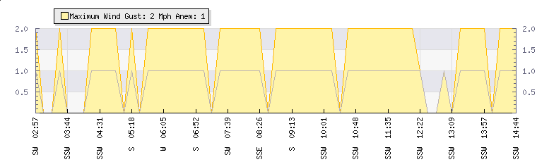 In the last few minutes the wind was South South West at an average speed of 0 mph, reaching up to 0 mph and a low of 0 mph. The gust strength is0 mph above the minimum speed |