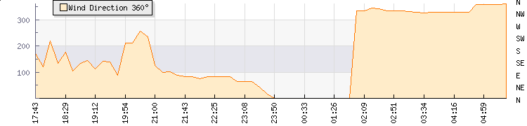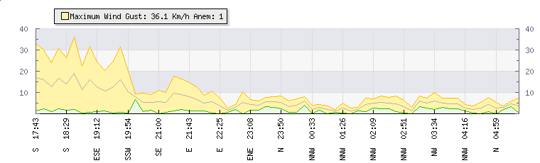 In the last few minutes the wind was North North West at an average speed of 5 kmh, reaching up to 8 kmh and a low of 1 kmh. The gust strength is7 kmh above the minimum speed |
