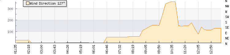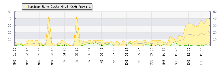 In the last few minutes the wind was Southerly at an average speed of 7 kmh, reaching up to 13 kmh and a low of 1 kmh. The gust strength is12 kmh above the minimum speed |