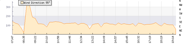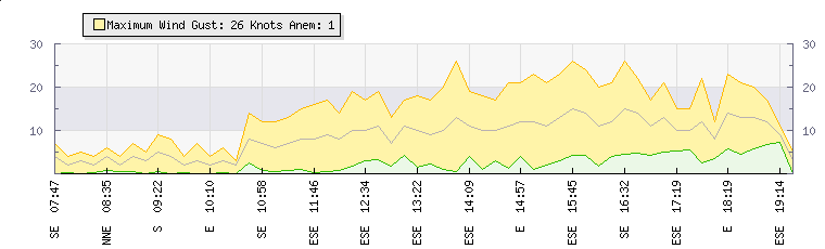 In the last few minutes the wind was East South East at an average speed of 13 knots, reaching up to 21 knots and a low of 5 knots. The gust strength is16 knots above the minimum speed |