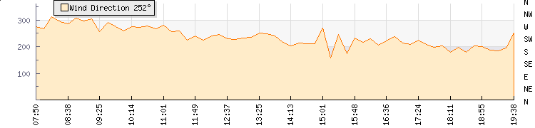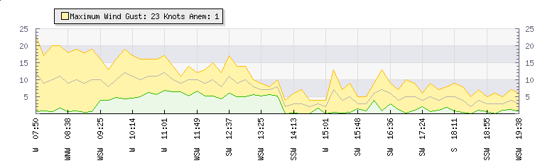 In the last few minutes the wind was South South West at an average speed of 4 knots, reaching up to 7 knots and a low of 1 knots. The gust strength is6 knots above the minimum speed |