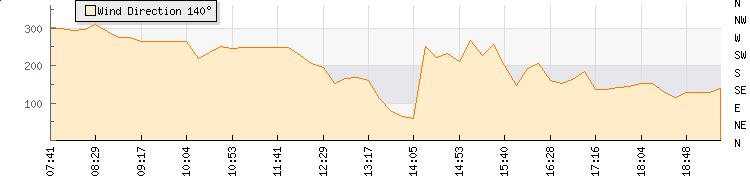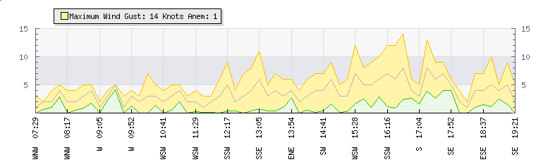 In the last few minutes the wind was South Easterly at an average speed of 7 knots, reaching up to 9 knots and a low of 4 knots. The gust strength is5 knots above the minimum speed |