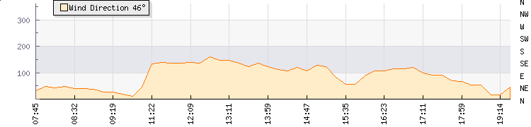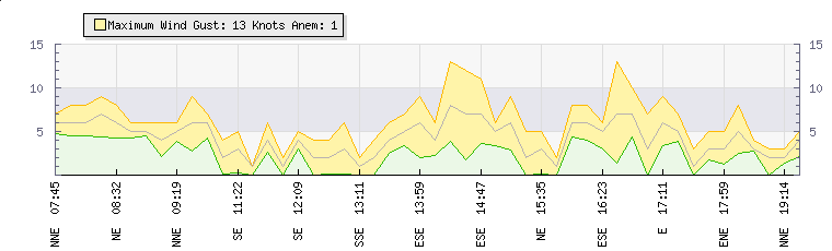 In the last few minutes the wind was North Easterly at an average speed of 5 knots, reaching up to 8 knots and a low of 2 knots. The gust strength is6 knots above the minimum speed |
