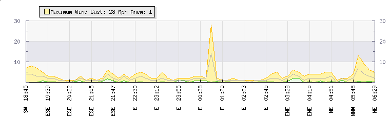 In the last few minutes the wind was East North East at an average speed of 2 mph, reaching up to 4 mph and a low of 1 mph. The gust strength is3 mph above the minimum speed |