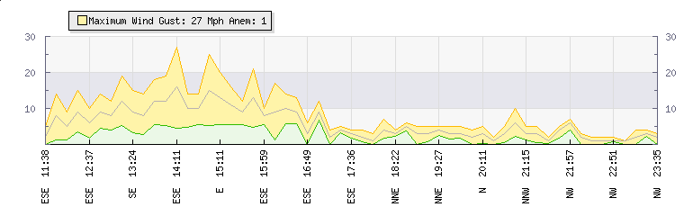 In the last few minutes the wind was North Westerly at an average speed of 1 mph, reaching up to 2 mph and a low of 0 mph. The gust strength is2 mph above the minimum speed |