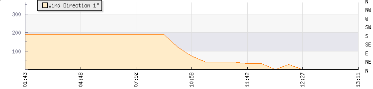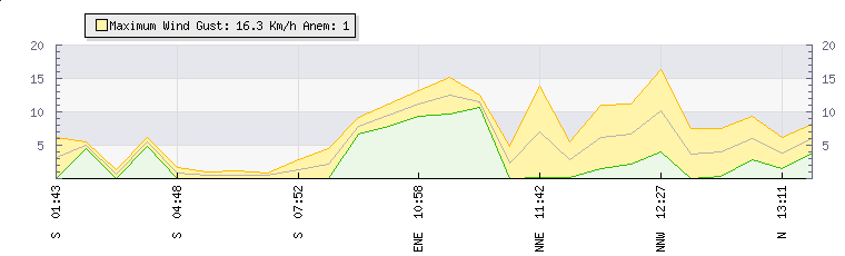 In the last few minutes the wind was Southerly at an average speed of 1 kmh, reaching up to 3 kmh and a low of 0 kmh. The gust strength is3 kmh above the minimum speed |