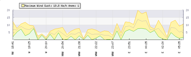 In the last few minutes the wind was Easterly at an average speed of 5 kmh, reaching up to 9 kmh and a low of 1 kmh. The gust strength is8 kmh above the minimum speed |