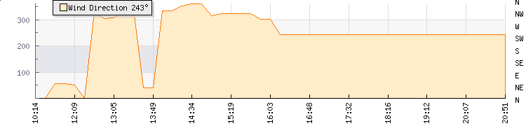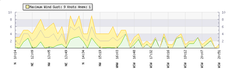 In the last few minutes the wind was West South West at an average speed of 2 knots, reaching up to 2 knots and a low of 1 knots. The gust strength is1 knots above the minimum speed |