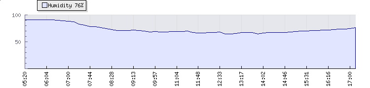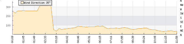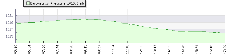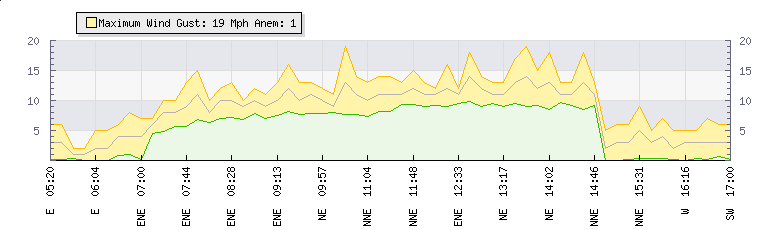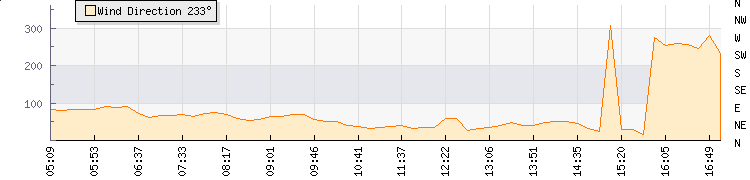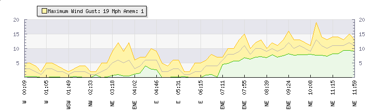 In the last few minutes the wind was Westerly at an average speed of 4 mph, reaching up to 7 mph and a low of 0 mph. The gust strength is7 mph above the minimum speed |
