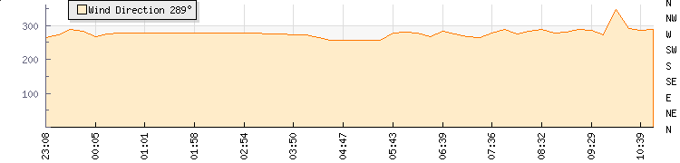 In the last few minutes the wind was West North West at an average speed of 6 kmh, reaching up to 10 kmh and a low of 1 kmh. The gust strength is9 kmh above the minimum speed |