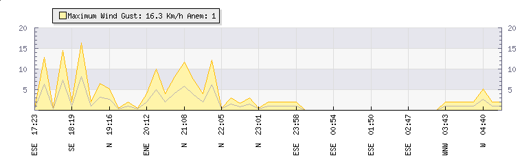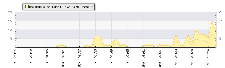 In the last few minutes the wind was North North East at an average speed of 1 kmh, reaching up to 2 kmh and a low of 0 kmh. The gust strength is2 kmh above the minimum speed |