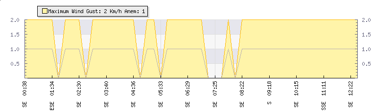 In the last few minutes the wind was South South East at an average speed of 1 kmh, reaching up to 2 kmh and a low of 0 kmh. The gust strength is2 kmh above the minimum speed |