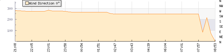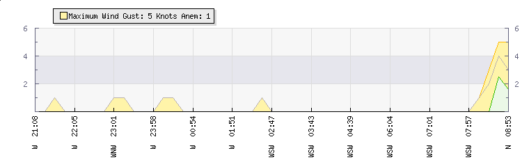 In the last few minutes the wind was West South West at an average speed of 0 knots, reaching up to 0 knots and a low of 0 knots. The gust strength is0 knots above the minimum speed |