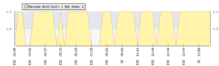 In the last few minutes the wind was Easterly at an average speed of 1 mph, reaching up to 1 mph and a low of 0 mph. The gust strength is1 mph above the minimum speed |