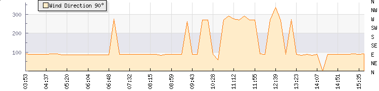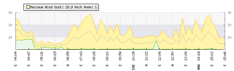 In the last few minutes the wind was Easterly at an average speed of 6 kmh, reaching up to 12 kmh and a low of 0 kmh. The gust strength is12 kmh above the minimum speed |