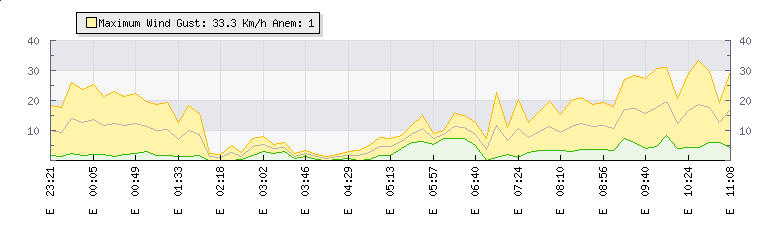 In the last few minutes the wind was Easterly at an average speed of 17 kmh, reaching up to 28 kmh and a low of 6 kmh. The gust strength is22 kmh above the minimum speed |