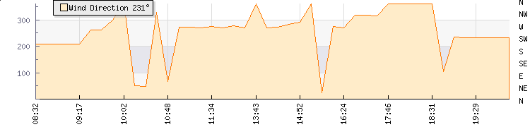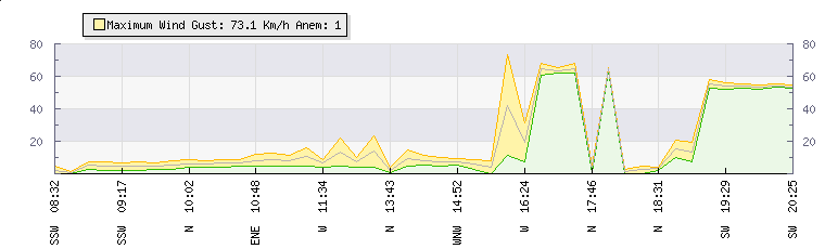 In the last few minutes the wind was South Westerly at an average speed of 13 kmh, reaching up to 19 kmh and a low of 7 kmh. The gust strength is12 kmh above the minimum speed |