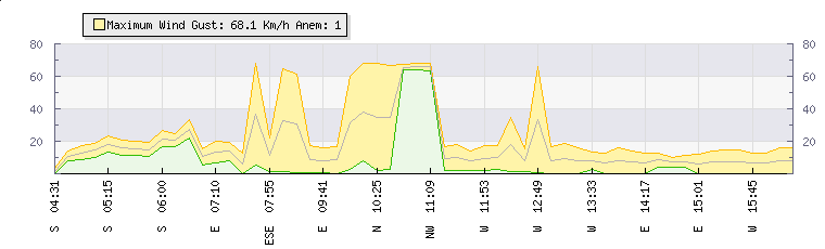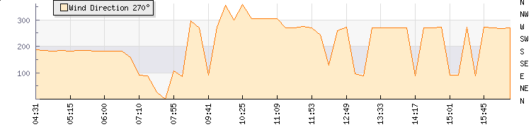 In the last few minutes the wind was Westerly at an average speed of 7 kmh, reaching up to 14 kmh and a low of 0 kmh. The gust strength is14 kmh above the minimum speed |