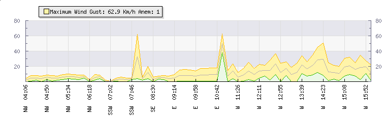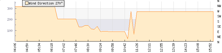 In the last few minutes the wind was Westerly at an average speed of 13 kmh, reaching up to 25 kmh and a low of 1 kmh. The gust strength is24 kmh above the minimum speed |