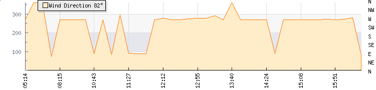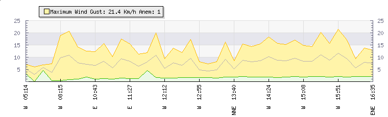In the last few minutes the wind was Westerly at an average speed of 10 kmh, reaching up to 17 kmh and a low of 2 kmh. The gust strength is15 kmh above the minimum speed |
