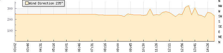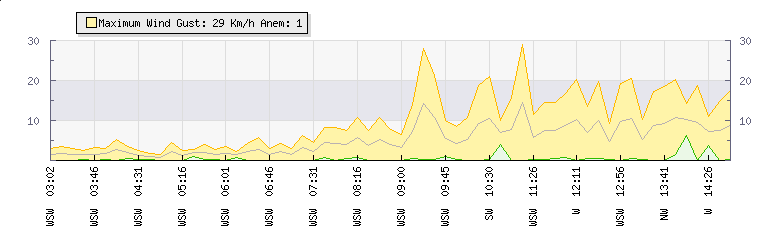 In the last few minutes the wind was West South West at an average speed of 7 kmh, reaching up to 14 kmh and a low of 0 kmh. The gust strength is14 kmh above the minimum speed |