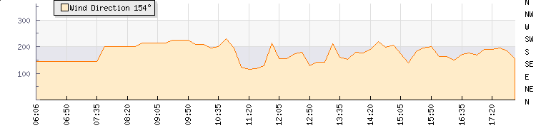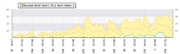 In the last few minutes the wind was South Easterly at an average speed of 11 kmh, reaching up to 23 kmh and a low of 0 kmh. The gust strength is23 kmh above the minimum speed |
