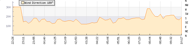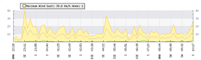In the last few minutes the wind was South South West at an average speed of 5 kmh, reaching up to 9 kmh and a low of 0 kmh. The gust strength is9 kmh above the minimum speed |