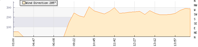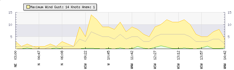 In the last few minutes the wind was Westerly at an average speed of 6 knots, reaching up to 11 knots and a low of 0 knots. The gust strength is11 knots above the minimum speed |