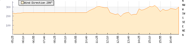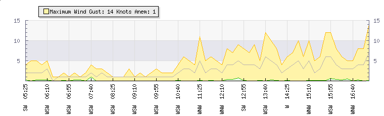 In the last few minutes the wind was West South West at an average speed of 6 knots, reaching up to 12 knots and a low of 1 knots. The gust strength is11 knots above the minimum speed |