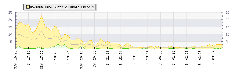 In the last few minutes the wind was Southerly at an average speed of 1 knots, reaching up to 2 knots and a low of 0 knots. The gust strength is2 knots above the minimum speed |