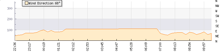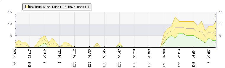 In the last few minutes the wind was East North East at an average speed of 7 kmh, reaching up to 9 kmh and a low of 4 kmh. The gust strength is5 kmh above the minimum speed |