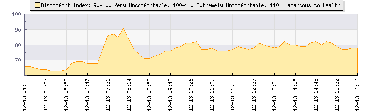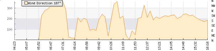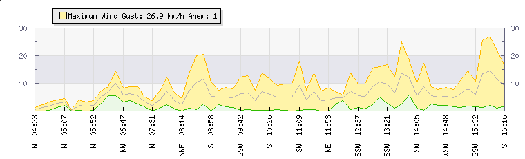 In the last few minutes the wind was South Westerly at an average speed of 9 kmh, reaching up to 17 kmh and a low of 0 kmh. The gust strength is17 kmh above the minimum speed |