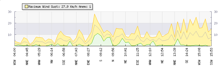 Weather Summary: In the last few minutes the wind was South Easterly at an average speed of 12 kmh, reaching up to 24 kmh and a low of 1 kmh. The gust strength is23 kmh above the minimum speed