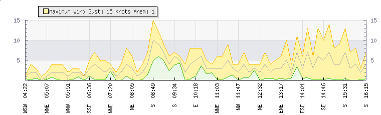 | Wind Gust: | 15 knots | Min Temp: | 14.9 °C | Max Temp: | 24.5 °C | | Wind Average: | 10 knots | Min Hum: | 10 % | Max Hum: | 10 % | |  |