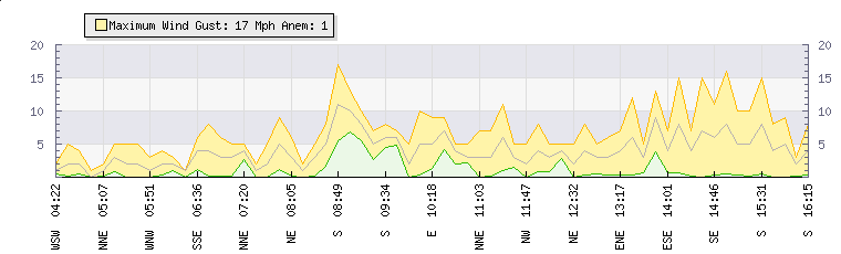 In the last few minutes the wind was South Easterly at an average speed of 8 mph, reaching up to 15 mph and a low of 1 mph. The gust strength is14 mph above the minimum speed |