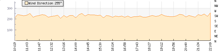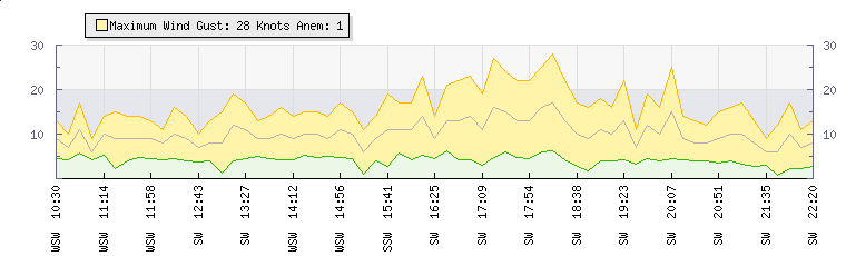 In the last few minutes the wind was Westerly at an average speed of 5 knots, reaching up to 7 knots and a low of 3 knots. The gust strength is4 knots above the minimum speed |