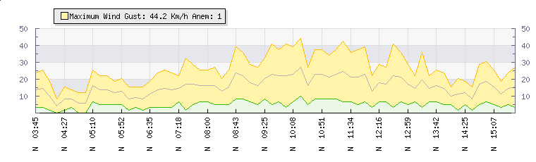 In the last few minutes the wind was Northerly at an average speed of 11 kmh, reaching up to 20 kmh and a low of 2 kmh. The gust strength is18 kmh above the minimum speed |