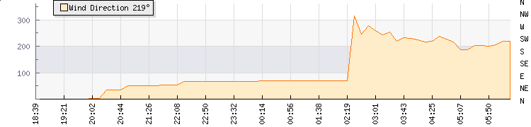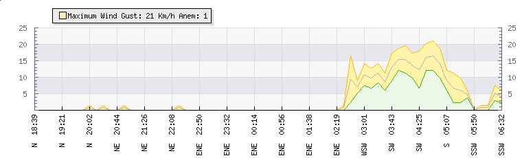 In the last few minutes the wind was East North East at an average speed of 0 kmh, reaching up to 0 kmh and a low of 0 kmh. The gust strength is0 kmh above the minimum speed |