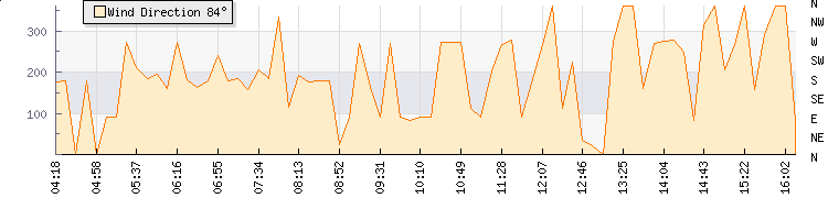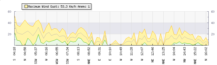 In the last few minutes the wind was Westerly at an average speed of 11 kmh, reaching up to 19 kmh and a low of 4 kmh. The gust strength is15 kmh above the minimum speed |